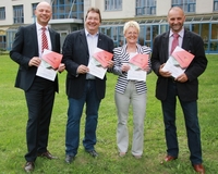 Nehmen die ersten, druckfrischen Exemplare des Strahlemann-Kalenders 2013 in Augenschein (von links): Josef Unger und Annabel Lies (JÄGER DIREKT), Strahlemann-Geschäftsführer…