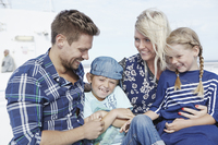 Gute Laune auf der Rückbank mit Tablet und Smartphone