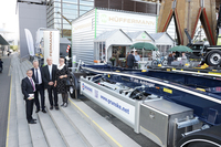 Neustadt/Dosse, Wildeshausen: Der traditionsreiche Fahrzeugbauer Hüffermann präsentiert auf der IAA in Hannover auf 300 qm sein komplettes Produktprogramm. Highlight war ein Behältertransportanhänger mit einer ganz besonderen Fahrgestellnummer: „17.000 Anhänger in der HN – Firmengeschichte aus der Neustädter Qualitäts-Schmiede“ Die Grunske Metall-Recycling GmbH & Co. KG aus Oranienburg Übernahm den Jubiläumsanhänger auf der Messe. Firma Grunske ist ein gemeinsames Unternehmen der ALBA-Gruppe und des Landkreises Oberhavel. Alba bezieht schon seit über 40 Jahren Anhänger von Hüffermann.