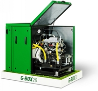 Bei einer thermischen Leistung modulierend von 20 bis 43 kW erzielt das neue BHKW-Modul mit Hilfe eines wassergekühlten Asynchrongenerators die elektrische Leistung von 10 bis 20 kW. Ein geregelter Drei-Wege-Katalysator reduziert die Emissionen bei Kohlenstoffmonoxid (CO) und bei Stickoxiden (NOx) auf unter 50 Prozent der TA Luft-Grenzwerte. Mittels einer Schallschutzhaube wird der Geräuschpegel auf max. 52 dB (A) vermindert, wodurch auch geräuschsensible Anlagenstandorte für die G-Box 20 geeignet sind.