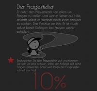 Der Fragensteller: Er nutzt die Hilfsbereitschaft und das Know-how der anderen und stellt im Newsstream vor allem Fragen. Lieber wartet er auf Hilfe, statt selbst im Intranet nach einer Antwort zu suchen. Jedoch ist er auch stets bereit, seinerseits Fragen von Kollegen zu beantworten.