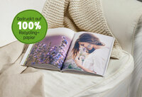 Das verwendete Papier für die Fotobuchseiten ist Blauer Engel zertifiziert – eine der anspruchsvollsten Zertifizierungen für umweltschonende Produkte. Das seidig-matte, weiße Papier mit nur minimalen Material-Einschlüssen aus dem Recyclingprozess sorgt für eine kräftige und schöne Farbwiedergabe. Es findet auch beim Motivdruck des Covers Verwendung.