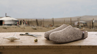Unbestritten beherrschen mongolische Handwerker die Technik des Filzens meisterhaft. Seit Jahrhunderten fertigen sie Schuhe zum Schutz vor Kälte und Hitze aus Wollfilz. Über Generationen weitergegebene Erfahrungen und reine Wollqualitäten aus umweltfreundlicher, mongolischer Tierzucht zeichnen die handgefertigten Hausschuhe aus. Verwendet werden atmungsaktive Schaf-, Yak- und Merinowollarten, die durch angenehme Weichheit und Wärme überzeugen.