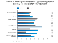 Dagegen scheint der Nutzen einer stärkeren Digitalisierung des Kerngeschäfts erkannt worden zu sein. 54 Prozent der Verantwortlichen setzen bei der Logistik und Materialwirtschaft entsprechende Schwerpunkte, zusätzlich etwa jedes zweite Branchenunternehmen auch in der Produktion. Damit setzen sie deutlich stärker auf den digitalen Wandel als andere Industriesektoren, wo zurückhaltender auf eine digitale Unterstützung der Produktions- und Logistikprozesse gesetzt wird.
