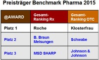 Im Gesamt-Ranking für das Jahr 2015 lagen Roche, B. Braun Melsungen und MSD SHARP auf den ersten drei Rängen für verschreibungspflichtige Medikamente (Rx), es folgten Sanofi-Aventis und HEXAL. Die Arzneimittelhersteller im Bereich OTC/Selbstmedikation werden getrennt erfasst, hier belegte 2015 Klosterfrau den ersten Platz, gefolgt von Dr. Willmar Schwabe und Johnson & Johnson.