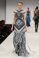 (NL/3570413482) Aufbauend auf der Diplomkollektion von Karen Jessen, Gewinnerin des International Awards der Graduate Fashion Week in London 2012, des Prix Créateur der Esmod Berlin 2012 und des React Fashion Awards 2012, verbindet die Debutkollektion 8 Acts of Rebellion von Benu Berlin kämpferische Attitüde und urbane Leichtigkeit. Filigrane, archaisch anmutende Strukturen auf Leder definieren feminine Silhouetten und setzen den Fokus auf Präzision und Detailreichtum. Leuchtende Feuer- und Wasserfarben in voluminösen Formen und expressiven Texturen zeigen sich in majestätischen Roben und fließenden Kleidern.