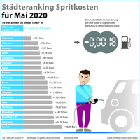 Den monatlichen Preisvergleich der 20 größten deutschen Städte von Clever Tanken entschied im Mai Nürnberg für sich als günstigste Super-E10-Tankstadt. 1,1230 Euro kostete hier der Liter im Monatsschnitt. Auf den Plätzen zwei und drei folgten Mannheim (1,1388 Euro) und München (1,1524 Euro).