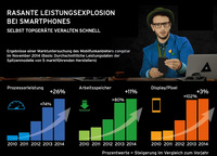 Die angehängte Grafik ist frei zum Abdruck, die Bildunterschrift lautet: Die congstar Studie belegt, dass selbst Top-Smartphones schon nach einem Jahr nicht mehr up-to-date sind. Die Prozessorleistungen haben sich allein 2014 gegenüber der Vorjahresgeneration um durchschnittlich ein Viertel gesteigert, im Vergleich zu 2012 sogar mehr als verdoppelt. Ähnliche Sprünge gab es beim Arbeitsspeicher, der Displayauflösung und den eingebauten Kameras.