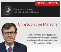 Der Journalist, Amerikaexperte und Redner Christoph von Marschall (http://celebrity-speakers.de/redner/1272/dr.-christoph-von-marschall) hat sein Themenspektrum erweitert. Der frühere US-Korrespondent des Tagesspiegels in Washington D.C. befasst sich seit seiner Rückkehr nach Berlin unter anderem mit Fragen der internationalen Sicherheitspolitik.
