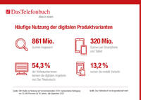 Das Telefonbuch mit der Zeit und passt sich in Hinblick auf die Medienumfelder den Bedürfnissen bzw. dem Nutzungsverhalten der Endverbraucher:innen an – beispielsweise im Bereich der Sprachassistenten oder im Bereich Messenger. Entsprechend kennen mittlerweile 54,3 % der Befragten die digitalen Angebote von Das Telefonbuch. Immer mehr Menschengreifen dabei auf die mobilen Varianten von Das Telefonbuch zurück – sei es per App oder über die mobile Webseite. Insgesamt verzeichnete Das Telefonbuch 861 Millionen Suchen im Jahr, 320 Millionen davon fanden über Smartphones und Tablets statt.