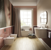 Eine große Auswahl an wohlproportionierter, unverwechselbar gestalteter Keramik gehört zur DEA-Linie, darunter Waschschalen, Waschtische, WCs mit Softclosing-Sitz, Bidets und Badewannen in zeitgenössischer Optik. Die Auswahl ermöglicht eine individuelle und zugleich harmonische Badezimmergestaltung unabhängig von der Größe des Bades.
