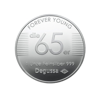 Auf der Vorderseite der Medaille sind historische Momente benannt, die das Leben der heute 50-Jährigen begleitet haben. Auf der Rückseite ist „die 65er“ unter dem Motto „Forever young“ eingeprägt sowie das Gewicht und die Metallqualität der Medaille „1 Unze Feinsilber 999“ angegeben.