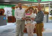 Bildunterschrift: Arne Meindl (links) und Jan Rütten (rechts) übernehmen von Andrea Niehaus, Leiterin des deutschen Museums Bonn (Mitte) den Aufsteller des Fördervereins WISSENschaf(f)t SPASS