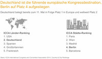 Die Zahl der für die ICCA-Statistik erfassten internationalen Verbandskongresse in Deutschland lag 2014 bei 659. Die USA kommen auf 831 Kongresse, Spanien folgt mit 578 gezählten Veranstaltungen wie in den Vorjahren auf Platz drei. Dahinter stehen Großbritannien, Frankreich und Italien, erst auf den Plätzen sieben und acht folgen mit Japan und China wieder außereuropäische Destinationen. Europa positioniert sich im Vergleich der Kontinente mit 55 Prozent der internationalen Verbandskongresse erneut mit Abstand auf Platz eins.