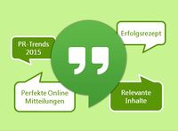 Erfahren Sie mehr über die Erfolgsgeheimnisse der Gewinner des Wettbewerbs „Beste Pressemitteilung 2014“. In einem Google-Hangout am 27. Januar 2015 sind Andrea Lachmuth von der PR-Beratung 21 (1. Platz), Ursula Martens (2.), Inhaberin der Agentur WORTKIND und Christian Krause (3.), Pressesprecher im Bereich Komposit für die Generali Versicherungen, dabei und plaudern aus dem Nähkästchen der Online-PR. Die PR-Trends 2015 werden von den drei Experten ebenso verraten, wie die Merkmale einer perfekten Pressemitteilung.