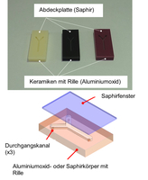 Dieses Produkt wird durch das Verbinden einer Keramik mit einem eingebauten Kanal und einer Saphir-Abdeckplatte geformt. Flache Kanäle von mehreren hundert Nanometern können auf der Keramikoberfläche geformt werden. Das Produkt wird verwendet für Beobachtungen der Reaktion flüssiger Proben und zur Analyse von Spurenstoffen. Aufgrund des hohen Korrosionswiderstands kann es für alle Chemikalien verwendet werden. Der Strömungsweg der Flüssigkeiten kann ebenfalls durch Entwerfen des Kanals in der erforderlichen Form beobachtet werden.