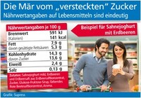 sup.- Verbraucher müssen sich beim Lebensmitteleinkauf keine Sorgen um „versteckten“ Zucker in Fertigprodukten machen. Auch wenn dies immer wieder behauptet wird. Wer sich über den Gesamtzuckergehalt der Ware informieren will, erhält hierüber mit einem Blick auf die Nährwerttabelle exakte Auskunft. Die Angaben auf dem Etikett beziehen sich immer auf 100 Gramm bzw. bei flüssigen Lebensmitteln auf 100 Milliliter des jeweiligen Produkts. Aufgelistet sind hier der Brennwert in Kilojoule bzw. Kalorien, der Fettgehalt inklusive Angaben zu den gesättigten Fettsäuren, der Anteil an Kohlenhydraten und davon gesondert der Zuckeranteil, außerdem wird auf den Eiweiß- sowie Salzgehalt hingewiesen.