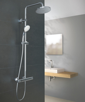 Ein Maximum an Komfort bildet ein komplettes Duschsystem mit wasserführender Brausestange, die direkt an den Ceratherm 60 Thermostat angeschlossen ist. Eine verchromte Regen-Kopfbrause mit 200 mm Durchmesser wird ergänzt durch eine 3-Funktionshandbrause mit angeschlossenem Brauseschlauch. Das komplette System eignet sich zur Neuinstallation, aber auch perfekt als Renovierungslösung, bei der eine alte Aufputz Brausearmatur einfach gegen das neue Ceratherm 60 System ausgetauscht wird.