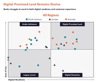 Die Mehrheit der Banken in Nordamerika und Europa fällt der Matrix zufolge in die Kategorie der am schlechtesten auf die Digitalisierung vorbereiteten – die digitalen „Under-Achiever“ -, wobei einige so sehr an ihren alten Systemen festhalten, dass sie schon daran scheitern, die Ebene der „Legacy Lover“ hinter sich zu lassen. Die Kategorie „Digitales gelobtes Land“ wird von sechs australischen Banken dominiert, die den Schnitt gemacht haben und hervorragend auf die Digitalisierung vorbereitet sind.