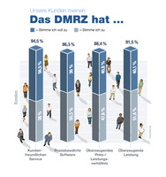 In der Erhebung wurden unter anderem auch verschiedene Qualitätsmerkmale des DMRZ untersucht. Dabei stimmen über 86 % der Kunden zu, dass das Deutsche Medizinrechenzentrum über eine praxisbewähre Software verfügt. Darüber hinaus stimmen für die Merkmale „überzeugende Leitung“ sowie „überzeugendes Preis-Leistungs-Verhältnis“ ebenfalls über 88 % der der Kunden zu.
