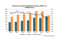 Berlin, November 2022 – Auch im dritten Quartal 2022 erreichen die Umsätze der deutschen Bauelementedistribution schwindelnde Höhen. Der Umsatz der beim FBDi gemeldeten Distributoren stieg um satte 44% auf 1,36 Milliarden Euro und übertraf damit das Rekordquartal Q1/2022 deutlich. Dagegen ging der Auftragseingang um 7% auf 1,44 Milliarden Euro zurück und normalisiert sich damit weiterhin. Die Book-to-Bill-Rate (Verhältnis Auftragseingang zu Umsätzen) ist mit 1,06 wieder im grünen Bereich.