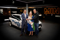 Wie es sich für eine hessische Kultur-Ikone gehört, wurde der Bembel-MINI von einer Kultur-Ikone offiziell eingeweiht: Die Frankfurter Apfelweinkönigin Bianca I. stieß mit MINI Brand Manager Florian Pokahr und Alexander Frost auf eine sichere Fahrt an – selbstverständlich mit Hessens Nationalgetränk, einem Schoppen „Stöffche“.