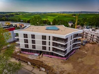 Noch wird an den beiden anderen Gebäuden gebaut: zum Jahresende wird das nächste Haus fertig sein und im Sommer kommenden Jahres ist der Abschluss mit dem Bezug des dritten Hauses und der Fertigstellung der Außenanlagen vorgesehen.