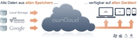 Mit ownCloud können Privatanwender und Unternehmen Adressen, Termine, Bilder, Office-, Video- und Audio-Dateien teilen und synchronisieren. Im Gegensatz zu Cloud-Storage-Diensten wie Dropbox oder Box bleiben die Dateien bei ownCloud auf den Speichersystemen des Anwenders – oder lagern bei einem vertrauenswürdigen Hosting-Dienstleister. Damit behalten Anwender und Unternehmen die volle Kontrolle über all ihre digitalen Inhalte.