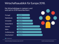 Im Süden Europas sieht es deutlich anders aus. Spanien hat mit hohen Staatsschulden, politischen Krisen und einem instabilen Arbeitsmarkt zu kämpfen. Mehr als die Hälfte der Arbeitnehmer (56%) rechnet mit einem Abwärtstrend in 2018. Schlusslicht in Europa ist unverändert Griechenland. Dort glauben 63%, dass die Wirtschaft weiter abrutschen wird. Die einzige Ausnahme bildet Portugal. Hier rechnen 68% der Beschäftigten mit einem wirtschaftlichen Aufwärtstrend.