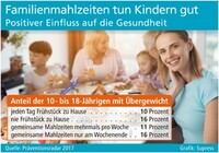 sup.- Zwischen den Frühstücksgewohnheiten sowie der Häufigkeit gemeinsamer Familienmahlzeiten und dem Risiko, dass Kinder und Jugendliche Übergewicht entwickeln, gibt es einen eindeutigen Zusammenhang. Zu diesem Ergebnis kommt der Präventionsradar 2017 der DAK-Gesundheit, für den das Institut für Therapie- und Gesundheitsforschung (IFT-Nord) repräsentativ knapp 7.000 Schüler im Alter von zehn bis 18 Jahren (Klassen 5 bis 10) befragt hat. Insgesamt entsprachen zwölf Prozent der Studienteilnehmer dem Kriterium für Übergewicht (BMI über dem 90. Perzentil). Kids, die nie zu Hause frühstücken, bringen mit 16 Prozent jedoch überproportional häufig zu viele Pfunde auf die Waage. Das gilt ebenso für diejenigen, die gemeinsame Mahlzeiten nur am Wochenende oder noch seltener im Kreise der Familie einnehmen.