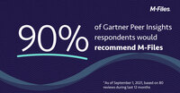 Ratingen, 6.9.2021 – M-Files, führender Anbieter für intelligentes Informationsmanagement, gab heute bekannt, dass das Unternehmen jetzt am Gartner Peer Insights Customer First Programm für Content-Services-Plattformen teilnimmt. Mit dem Beitritt zu diesem Programm verpflichtet sich M-Files dazu, die direkte Bewertung durch Kunden zu fördern. Die Bewertungen werden von Gartner gründlich geprüft und liefern verwertbare, objektive Erkenntnisse. So werden Vertrauen und Glaubwürdigkeit weiter ausgebaut und M-Files nutzt das gewonnene ehrliche, unvoreingenommene und direkte Feedback, um die Produkte noch weiter zu verbessern. Basierend auf 80 Bewertungen aus den letzten 12 Monaten empfehlen 90 Prozent der Befragten M-Files als Content-Services-Plattform (Stand 1.9.2021).