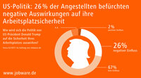 (Mynewsdesk) Paderborn. 06. März 2017 – 26 Prozent der Angestellten in Deutschland fürchten, dass sich die Politik des neuen US-Präsidenten Donald Trump negativ auf die Sicherheit ihres Arbeitsplatzes auswirken wird. Dies ist das Ergebnis einer aktuellen Forsa-Befragung im Auftrag der Jobbörse Jobware. Möglicher Risikofaktor könnte die Erhebung von Einfuhrzöllen auf deutsche Waren sein.