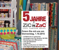 [Essen] Mit einem großen Aktionstag feiert ZiC´nZaC, der Näh-Szene-Store in der Essener Innenstadt, am 1.Oktober sein fünfjähriges Bestehen. Die Kundinnen und Kunden erwartet ein Tag mit Workshops, mit Late Night Shopping, Live-Musik, einer Nähmaschinen-Versteigerung, einem Gewinnspiel von Nähkursen, besonderen Verkaufsaktionen und natürlich leckeren Snacks und Getränken, mit denen Alle auf das Jubiläum anstoßen können.