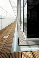 Um die Balkone, die Außenanlage mit ihren Terrassen sowie die Fassade vor Niederschlagsfolgen zu schützen, waren Entwässerungssysteme notwendig. Diese sollten sich sowohl funktional als auch optisch harmonisch in den Gebäudekomplex einfügen. Der Dränagerost Hydra Linearis der Richard Brink GmbH & Co. KG erfüllt diese Anforderungen in idealer Weise. Aufgrund der geringen Abstände zwischen den Längsstäben besteht selbst mit Pfennigabsätzen keine Gefahr, darin hängen zu bleiben. Außerdem ist der mit dem red dot award prämierte Rost aus Edelstahl ein Designobjekt, das sich ohne Seiteneinfassung optimal in die architektonische Gesamtkonzeption einfügt. Für die Balkongestaltung in der obersten Etage spielt das Design des Hydra Linearis Rosts eine besondere Rolle: Eine vorgesetzte LED-Zierleiste setzt ihn ins rechte Licht. Aufgebaut wurde der Längsstabrost auf die fixe Dränagerinne Stabile, von der mehrere hundert Meter geliefert wurden.