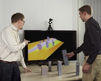 Am Fraunhofer IGD arbeitet man seit mehreren Jahren daran Strömungssimulationen mithilfe von Prozessoren moderner Grafikkarten so zu beschleunigen, dass der Ingenieur oder Designer seinen Entwurf direkt überprüfen kann. „Unser Demonstrator zeigt, was möglich wird, wenn die Berechnungen einzelner Simulationsschritte in Bruchteilen von Sekunden durchgeführt werden können“, erklärt Professor André Stork vom Fraunhofer IGD. „Der Benutzer kann direkt die Simulation betrachten während diese berechnet wird und gleichzeitig mit dem System interagieren.“ Im Demonstrator „Tangible Simulation“ wird die Windströmung für mehrere, reale Objekte in Form von Geschwindigkeits- und Druckfeldern berechnet. Eine Kamera erfasst dabei die realen Objekte, um deren Position und Geschwindigkeiten zu bestimmen.