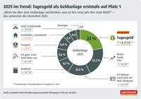 Aufsteiger des Jahres – von Platz 3 direkt auf Platz 1: Der Wunsch der Deutschen, im Jahr 2025 genauso viel zu sparen wie 2024, liegt ganz weit vorn – mit Abstand. Fast jede:r Dritte (27,9 Prozent) hat diesen Plan. Das sind deutlich mehr als im Vorjahr (plus 9,5 Prozentpunkte). Und welche Geldanlage liegt im Trend? Vor allem das Tagesgeldkonto, denn es gilt als sichere Bank in unsicheren Zeiten. Es überholt damit die Börsen-Investments und liegt erstmals auf Platz 1.