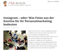 Bei der Frage, wie man sich der Öffentlichkeit als attraktiver Arbeitgeber präsentiert, hilft seit Anfang 2013 das mats-blog.de Team. Rund ums Thema Personalmarketing 2.0 finden Personaler auf mats-blog viele Fachartikel, sowie einen Glossar, in dem die wichtigsten Begriffe erläutert werden. Dass sich das Personalmarketing immer noch stetig verändert, zeigt der neueste Trend: Instagram. 90 Millionen Menschen benutzen die Applikation weltweit bereits jeden Monat. Auf die Idee Instagram auch für Personalmarketing zu benutzen sind bislang jedoch nur vergleichsweise wenige deutsche Unternehmen gekommen. Doch dies ändert sich stetig. Unternehmen wie EDEKA oder die Berliner Wasserbetriebe gewähren bereits lustige Einblicke in ihr Unternehmen. Ob aus der gemeinschaftlichen Mittagspause, von der Firmenfeier oder dem Feierabendbier, ungestellte Bilder zeigen die Firmenkultur besser als jede Werbekampagne. In den USA ist Instagram schon längst in den Unternehmen angekommen, Starbucks und Marriot beispielsweise zeigen via Instagram, wie viel Spaß die Arbeit machen kann. Auf mats-blog findet man nun eine Anleitung, wie man mit einem kostenlosen Account, einem Smartphone und fleißigen Fotografen Instagram auch für das eigene Unternehmen nutzen kann.