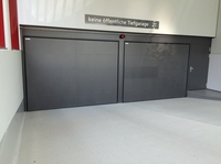 Die beiden Tore messen jeweils 3.000 mal 2.400 Millimeter und sind Zugänge zu einer Tiefgarage mit 25 Stellplätzen. Die Befestigung der Auflage aus Aluminium Glattblech in Metallic-Optik mit der Farbbezeichnung DB Ton 703 ist nicht sichtbar. Das Tor hebt sich bewusst von der hellen Fassade ab und bildet einen auffälligen Kontrast. Die Fenster der Fassade sind senkrecht und geradlinig angeordnet – genauso wie die Glattbleche auf dem Torflügel. So entsteht ein stimmiges Gesamtbild.