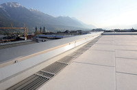 Neben der architektonischen Gestaltung lag der Fokus beim Bau des Kaufhauses Tyrol auf dem langfristigen Erhalt der Gebäudesubstanz. Dauerhafte Schäden können beispielsweise durch eindringende Feuchtigkeit infolge starker Niederschläge entstehen. Im Extremfall können solche Feuchtigkeitsschäden die Statik eines Gebäudes gefährden. Um das anfallende Wasser auf den 16 unterschiedlichen Einzelflächen gezielt abzuleiten, wurden rund um das gesamte Dach Dränagerinnen der Firma Richard Brink GmbH und Co. KG verlegt. Ausführender Verarbeiter war die Auer Dachsysteme GmbH aus Innsbruck. Die Richard Brink GmbH & Co. KG war für Inhaber Christian Auer beim Bau des Kaufhauses Tyrol stets ein verlässlicher und kompetenter Partner, um für alle Teilflächen von 20 bis 2.300 Quadratmetern die richtige Lösung zu finden.