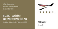 Düsseldorf, 10. Dezember 2015 – In ihrem aktuellen KFM-Barometer zur 8,25% Anleihe der GRENKELEASING AG (WKN A161ZB) kommt die KFM Deutsche Mittelstand AG zu dem Ergebnis, die Anleihe als „attraktiv“ (4 von 5 Sternen) einzuschätzen.