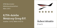 Düsseldorf, 16. März 2015 – In ihrem aktuellen Mittelstandsanleihen-Barometer zu der 8,75%-Metalcorp-Anleihe (A1HLTD) kommt die KFM Deutsche Mittelstand AG zu dem Ergebnis, die Anleihe weiterhin als „äußerst attraktiv“ einzustufen.