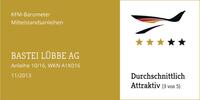 Düsseldorf, 15. November 2013 – In ihrem aktuellen Mittelstandsanleihen-Barometer zu der Bastei Lübbe-Anleihe (A1K016) kommt die KFM Deutsche Mittelstand AG zu dem Ergebnis, die Anleihe zurückzustufen. Grund ist alleine die gute Kursentwicklung, die die Rendite für Neu-Investoren schmälert. Das Unternehmen überzeugt weiterhin mit guten Geschäftszahlen und hat zuletzt auch seine Kapitalbasis um knapp 25 Mio. Euro durch den Börsengang kräftig gestärkt. Nachdem die Anleihe beim Start (Kupon und Rendite von 6,75%) im KFM-Mittelstandsanleihen-Barometer mit äußerst attraktiv (5 von 5 möglichen Sternen) bewertet wurde, ergibt die Neubewertung – aufgrund des Kursanstiegs auf 110% und des damit verbundenen Renditerückgangs – eine Rückstufung auf „durchschnittlich attraktiv“ (3 von 5 möglichen Sternen).