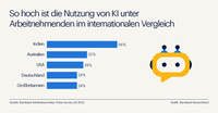 Was die Schulung und Weiterbildung im Bereich KI betrifft, hat Deutschland noch Luft nach oben. Nur 8% der deutschen Arbeitnehmer gaben an, in den letzten zwölf Monaten spezielle Schulungsangebote im Bereich KI erhalten zu haben. Im internationalen Vergleich lag nur Großbritannien mit 7% noch darunter. In den USA erhielten 11% der Beschäftigten Schulungsangebote in künstlicher Intelligenz, in Australien waren es 12%. Spitzenreiter in dieser Kategorie ist erneut Indien mit 24%.