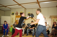 Das Beste aus jedem einzelnen herauszuholen, war die Mission des Kickbox-Stars. Der Trainigs-Tag mit den zwanzig, im September 2014 gestarteten Auszubildenden begann gleich einmal mit der richten Performance bei der Vorstellung: Wer schon schlaff in den Ring steigt, kann nicht gewinnen. In Kleingruppen wurden social skills identifiziert und Tricks und Kniffe erarbeitet, die neben notwendigem Fachwissen Erfolg ausmachen. Mental- und Konzentrationsübungen rundeten den Tag ab. Mit viel Spaß und Motivation wurden die Trainingsziele Disziplin, Aufmerksamkeit, Konzentrationsfähigkeit, Selbstsicherheit und Teamfähigkeit wurden an diesem Tag im vollen Umfang erreicht.