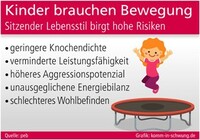 sup.- Der vorwiegend sitzende Lebensstil ist eine Verhaltensweise, die im Erwachsenenalter mit zahlreichen Folgeerkrankungen wie Diabetes vom Typ-2, Herz-Kreislaufstörungen sowie einer erhöhten Wahrscheinlichkeit für bestimmte Krebsarten in Verbindung gebracht wird. Studien weisen zudem darauf hin, dass auch schon bei Kindern und Jugendlichen eine sitzende Lebensweise mit etlichen Risiken in Zusammenhang steht. Dazu gehören nach Informationen der Plattform Ernährung und Bewegung (peb) u. a. eine geringere Knochendichte, verminderte Leistungsfähigkeit, ein höheres Aggressionspotenzial sowie ein insgesamt schlechteres Wohlbefinden. Außerdem fördert die Dominanz von sitzenden Tätigkeiten ein Ungleichgewicht von Energieaufnahme und Energieverbrauch, wodurch Übergewicht begünstigt wird.