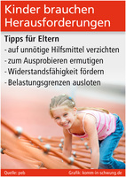 sup.- Kinder brauchen von klein auf Herausforderungen, die sie fordern und fördern. Eltern sollten ihren Nachwuchs aufmerksam begleiten, aber nicht in Watte packen. Übertriebene Fürsorge verhindert den Aufbau eines positiven Selbstkonzeptes, das Basis für die Entwicklung zu einer starken Persönlichkeit ist. Die Botschaft der „Plattform Ernährung und Bewegung“ (peb) lautet: „Probier etwas mal selber und du wirst stolz und glücklich sein, wenn du es geschafft hast“, so die peb-Vorstandsvorsitzende und Sportpsychologin Prof. Ulrike Ungerer-Röhrich. So sollten Eltern z. B. auf unnötige Hilfsmittel wie einem Dreirad mit Stange oder ständigem Buggy-Einsatz verzichten.