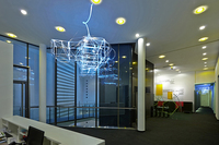 Im mittleren Teil des Business Centers wurde die Arbeit „EDUCATION LYRIC“ installiert. Die Aufteilung der Acrylboxen sowie Buchstaben spiegelt sich durch den Schatten an der Wand wider und schafft so eine Plattform für Denkanstöße. Die Arbeit „PERIODIC SYSTEM“ entwickelte der Künstler eigens für den Meetingraum. Dort schafft Biedermann an der Decke ein eigenes Bilduniversum. Zeichen lässt er in assoziativer Weise zueinander spielen und verschmilzt verschiedenen Systeme miteinander.