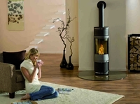 Und damit der gertenschlanke Guss-Kaminofen – mit weniger als 40 cm im Durchmesser – auch in kleinere Räume passt, wurde der Feuerraum einfach „tiefer gelegt“. Umso mehr Raum bietet sich den Flammen über dem Brennzylinder. Denn das ist es ja, was fasziniert und was hinter der extra großen, elegant gewölbten 180-Grad-Panoramascheibe zu sehen sein soll: das beeindruckende Flammenspiel.