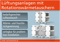 Ebenso sinnvoll wie die Übertragung von Wärmereserven aus verbrauchter Luft auf die zugeführte Frischluft ist die Feuchterückgewinnung. Gerade in der kälteren Jahreszeit ist es erforderlich, in den meist gut isolierten und automatisch belüfteten Arbeitsräumen unangenehm trockene Luft zu vermeiden. Kompakt-Lüftungsgeräte der neuesten Generation, wie sie der Systemspezialist Wolf Heiz- und Klimatechnik (Mainburg) anbietet, verfügen dafür mit so genannten Rotationswärmetauschern über die perfekte technische Ausstattung. Dieses Funktionsprinzip, bei dem die Wärme über eine rotierende Speichermasse zwischen zwei Luftströmen übertragen wird, macht die Geräte unempfindlich gegen Vereisung und sorgt je nach Rotortyp auch dafür, dass keine Kondensatabfuhr notwendig ist (www.wolf-heiztechnik.de). Die hohe Ergiebigkeit bei der Wärme- sowie Feuchterückgewinnung und der Bedienkomfort dieser Geräte bieten alle Voraussetzungen für eine dauerhaft angenehme Atmosphäre z. B. in Büros, Besprechungsräumen, Kantinen, Gaststätten oder anderen Gewerbebetrieben. Dort spielt je nach Gebäude noch ein weiteres Talent der Kompaktgeräte schon vor der Inbetriebnahme eine entscheidende Rolle: die „Einbringzerlegbarkeit“. Damit ist gemeint, dass beispielsweise ein Gerät der Baureihe Wolf CRL in drei separaten, anschlussfertigen Teilen an den Aufstellungsort gebracht werden kann. Dies erlaubt auch bei engen Grundrissen und schmalen Durchgängen eine problemlose Installation, für die die Anlage nach dem Prinzip Plug & Play anschlussfertig verdrahtet ist.