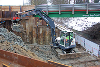 Im ersten Schritt wurde eine Behelfsbrücke rechts der alten Fahrbahn erstellt. Im Anschluss konnte die alte Brücke sukzessive zurück gebaut werden. Bei den Gründungsarbeiten für die neue Brückenkonstruktion werden Spundwände eingebracht und rund 3.500 Kubikmeter Erdreich und Schluff ausgehoben. In rund 9 Meter Tiefe wird das Fundament, das auf 15 Meter langen Bohrpfählen (D = 0,90 Meter) ruht, erneuert – hierbei ist ein 12-Tonnen-Kompaktbagger aus dem HKL MIETPARK aktiv. Er wurde per Autokran in die Baugrube gehoben. Der Bagger befördert den Aushub auf eine zweite Ebene, von der aus ein weiterer Bagger das Material auf LKWs verlädt. Während der gesamten Bauarbeiten musste gewährleistet sein, dass die Hafenbahn ihren Fahrplan einhalten konnte.
